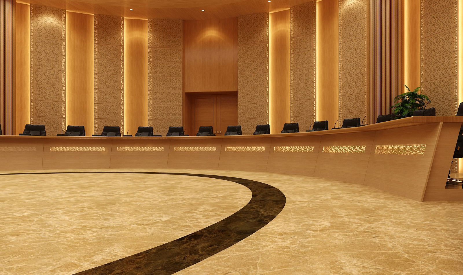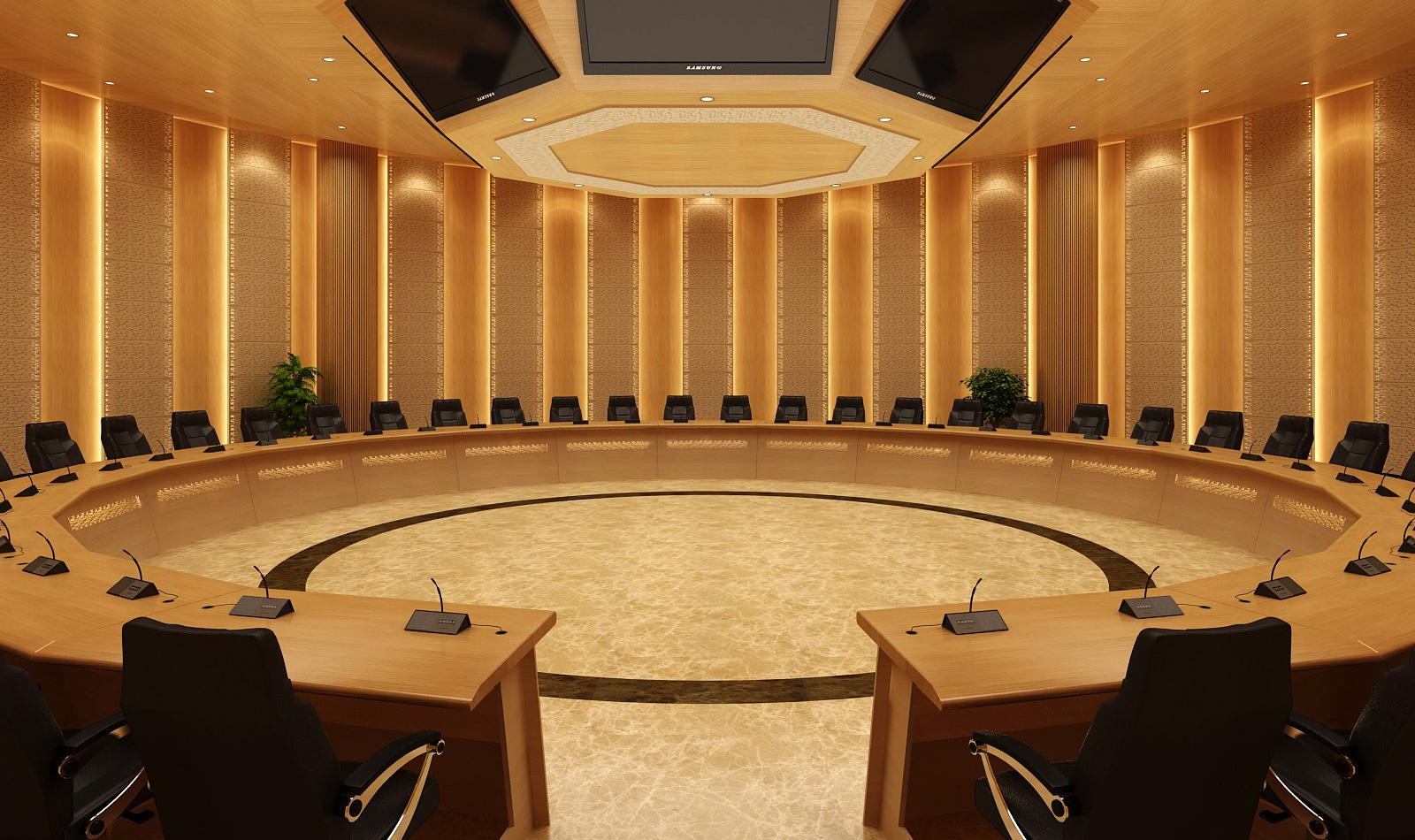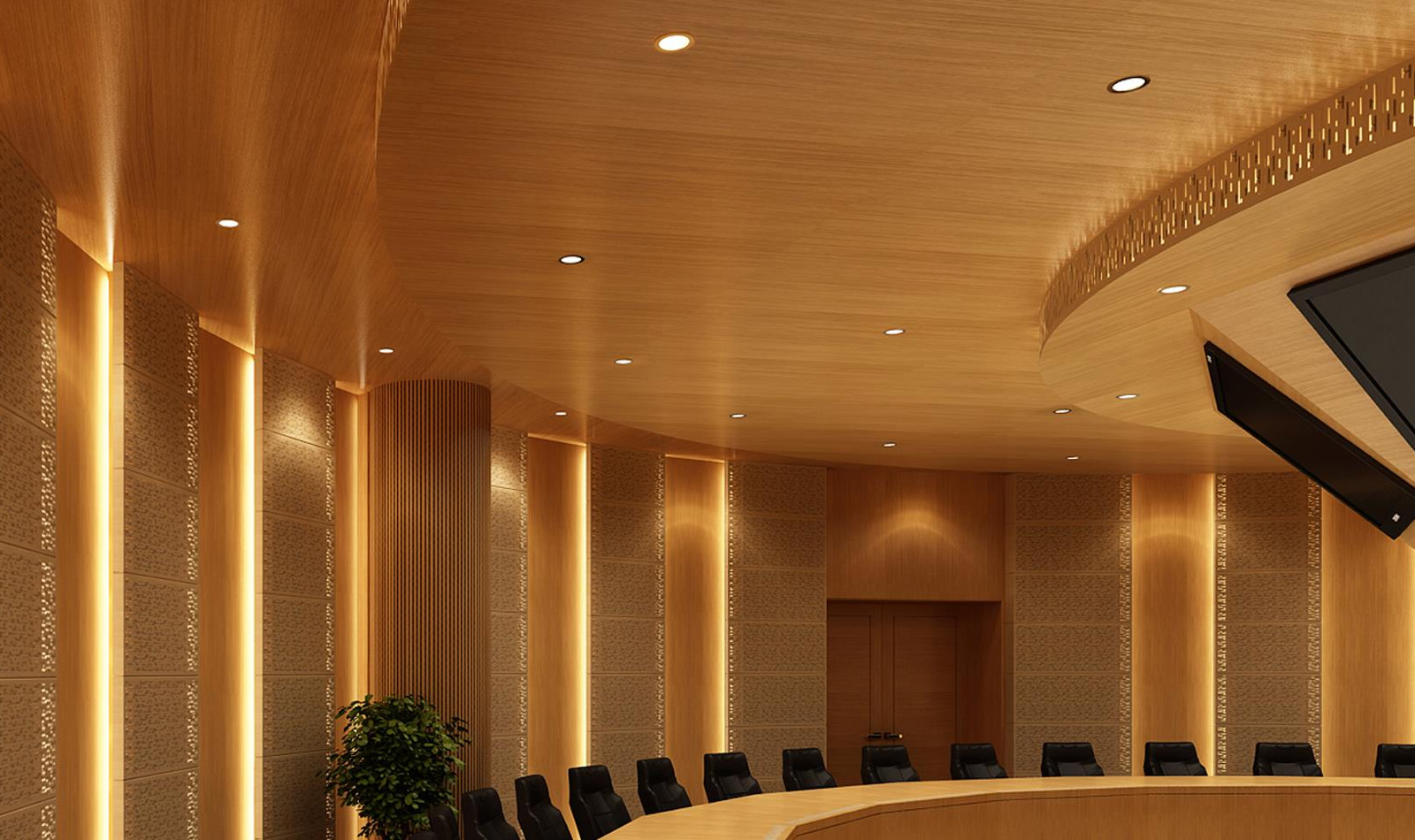 Woodfit manufactured custom boardroom tables with matching wall and ceiling panelling for the conference room.